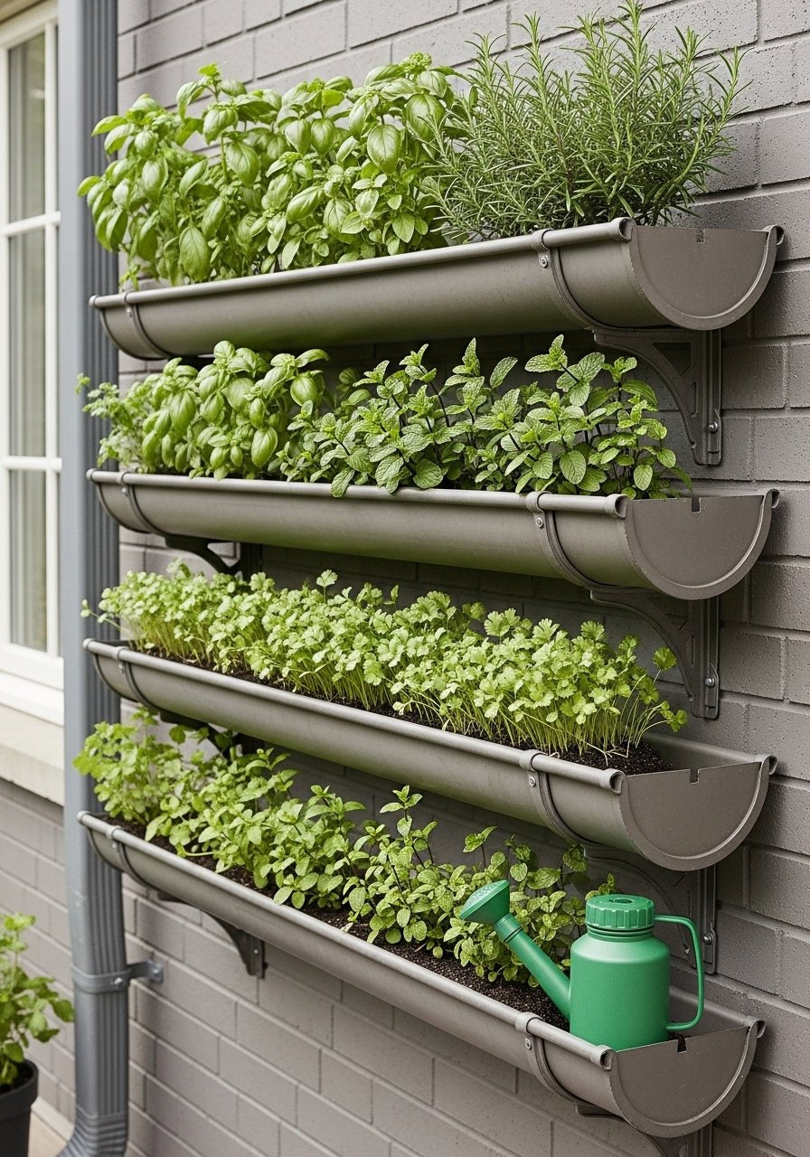 I hung sections of cleaned gutters and filled them with herbs; it looks neat and saves soil. I can line up mint, oregano, and thyme without losing ground space. The trick was adding drainage holes and a layer of gravel. Use a long, narrow trough style like self-watering-planter for less daily watering.