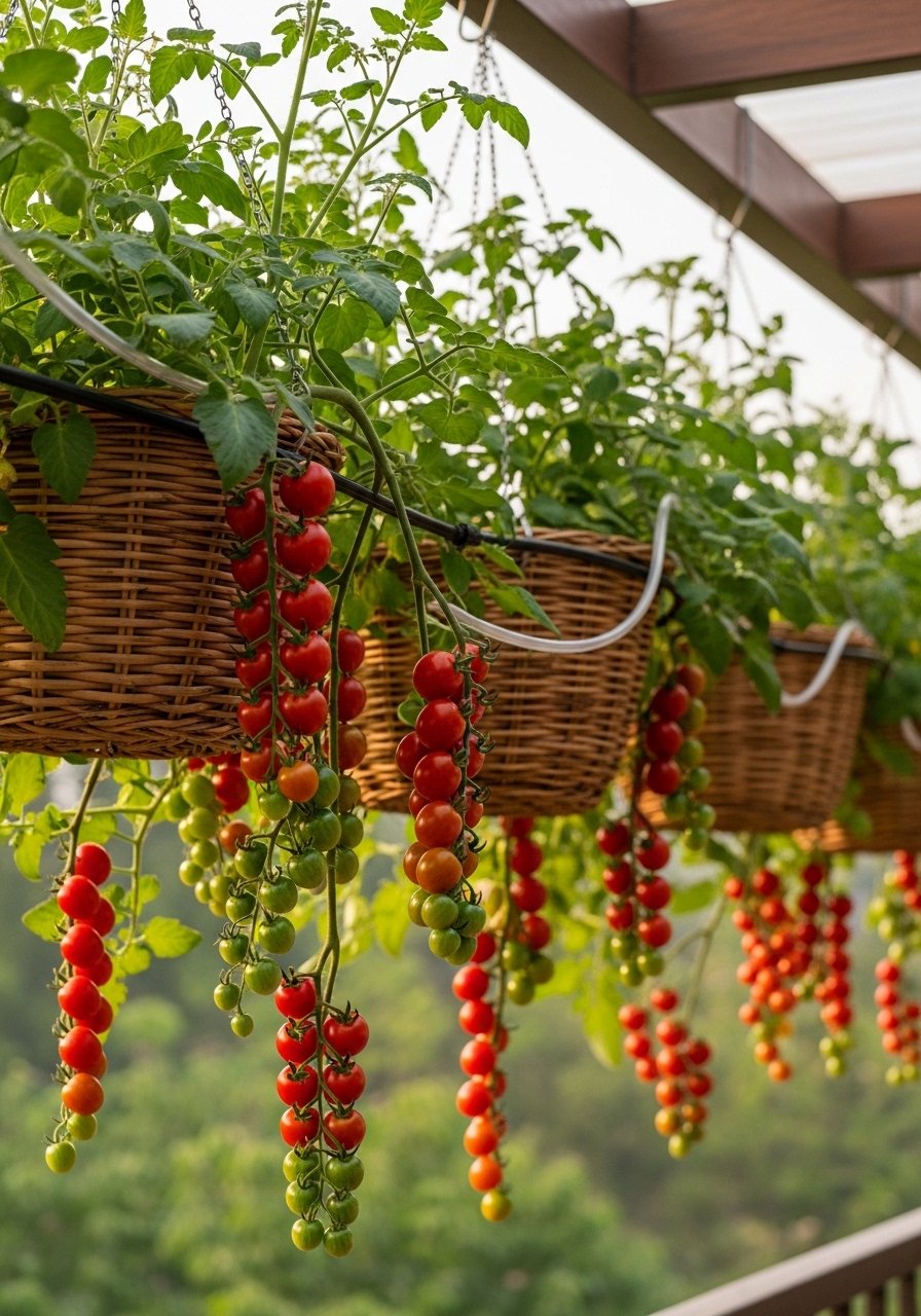 I switched to indeterminate cherry tomatoes in hanging baskets to avoid floor space hogs. They produced a surprising amount of fruit, and I like grabbing handfuls without bending. Feed with soluble fertilizer every couple weeks and choose compact varieties. A lightweight self-watering-planter version keeps them easier to manage.