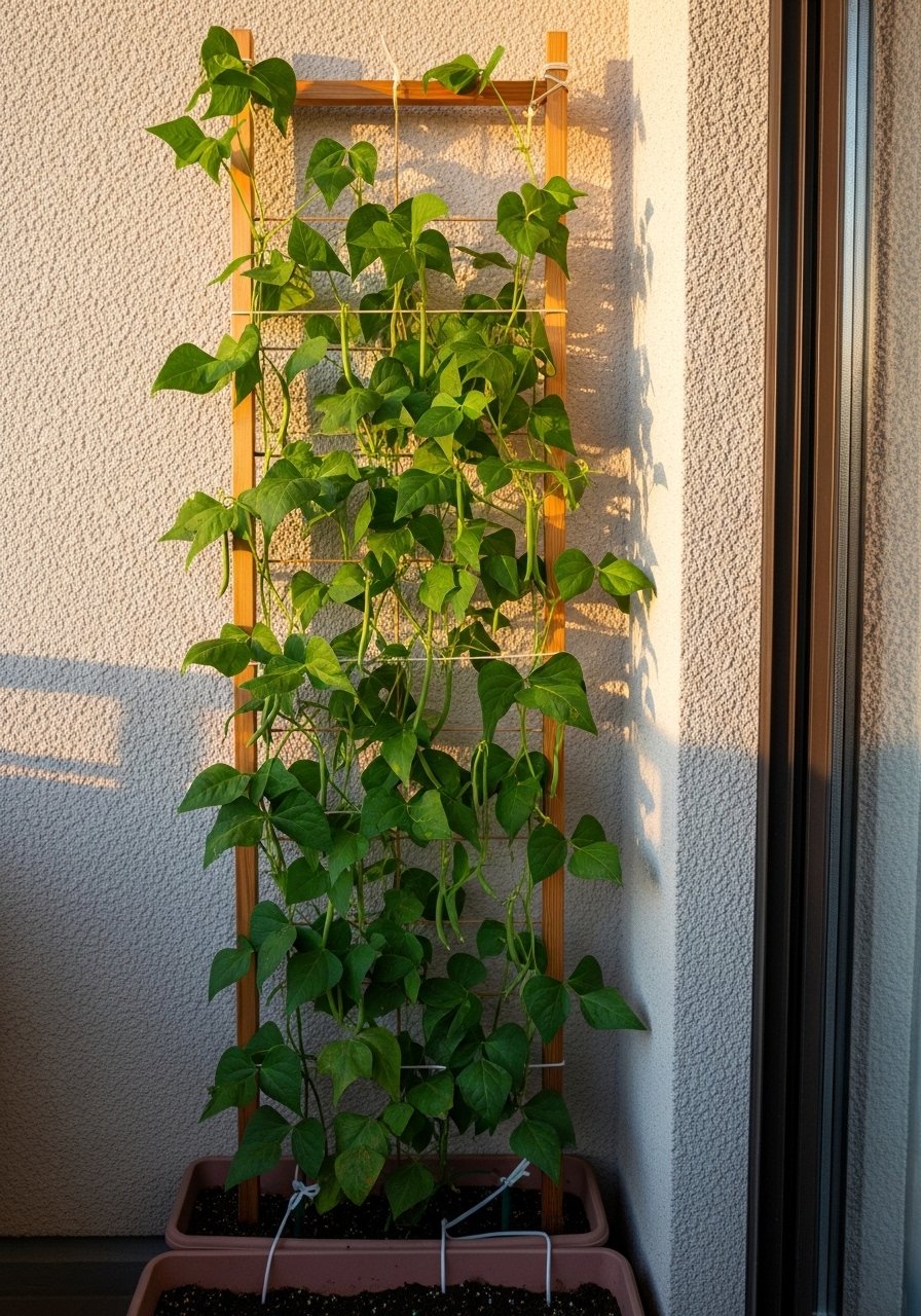 I installed a skinny trellis and planted pole beans at the base; they climbed and provided a privacy screen. I like that it gives vertical shade and edible payoff. Plant two beans per pocket and pinch early tips to encourage branching. A simple bamboo-trellis works great.