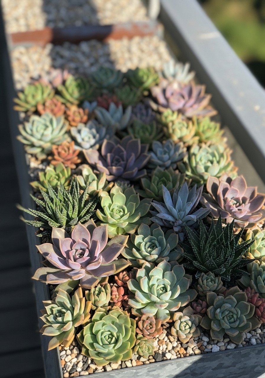 I made a shallow succulent rail garden for hot, sunny areas. Once established, watering is rare and it looks tidy. Succulents save time and they are surprisingly long-lived in small planters; I have pots that are three years old and still thriving. Use a gritty potting-mix and a low-watt solar accent light.