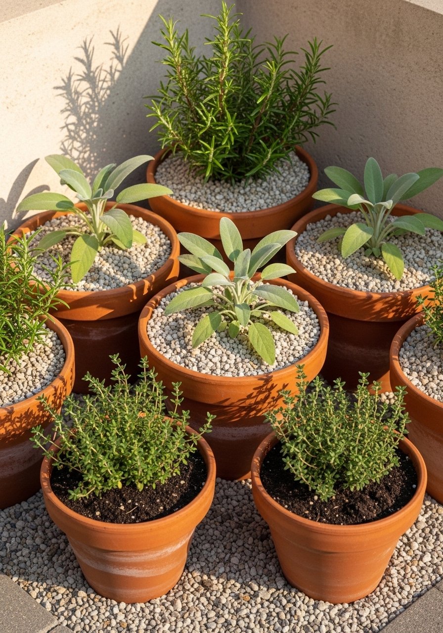 I created a Mediterranean palette in terracotta pots for a sunny corner. Drought-tolerant plants thrive with minimal attention and they smell great when you walk by. I keep pots grouped for microclimate benefits. Terracotta breathes but dries fast, so plan watering accordingly.
