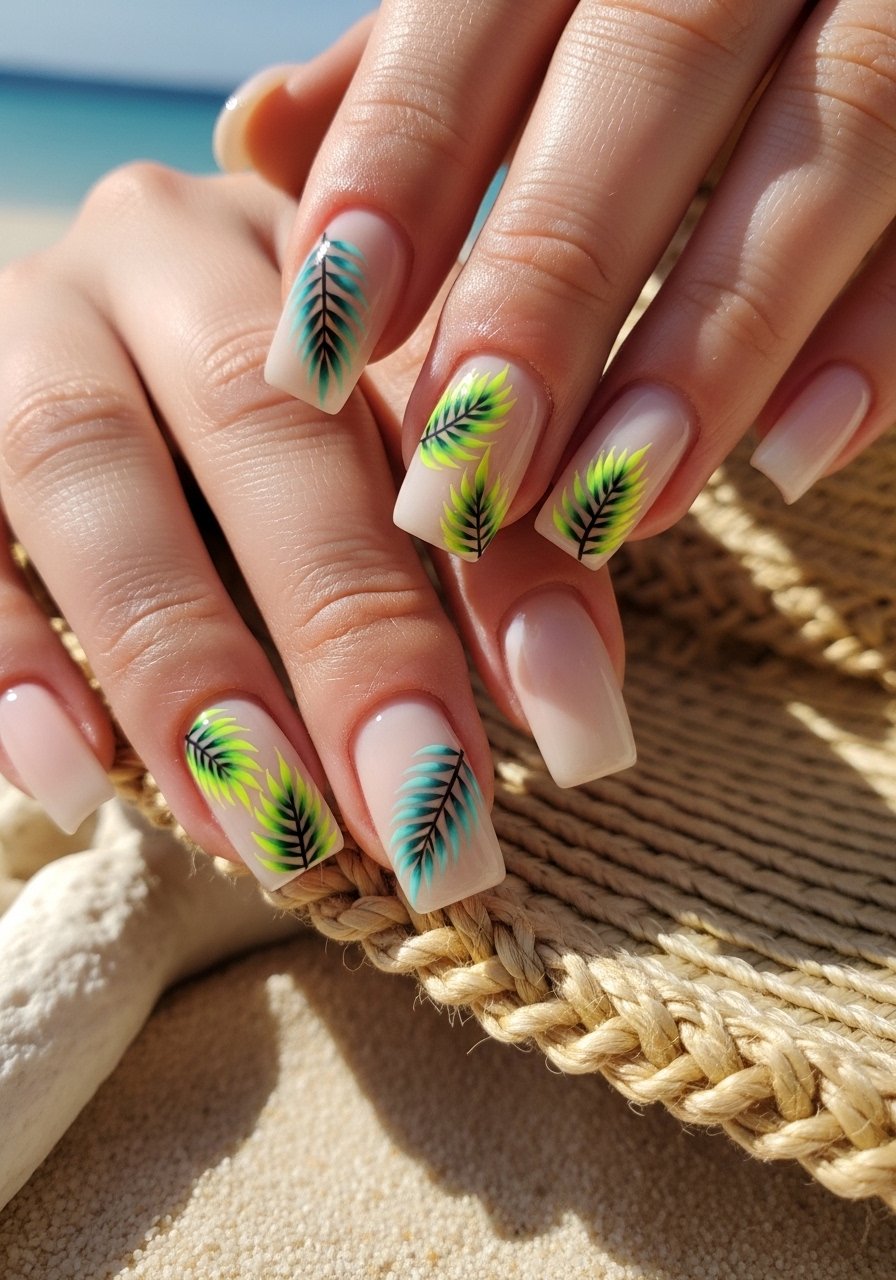 I use a soft neutral base and two accent nails for a fun summer vibe that doesn’t scream neon all over. A fine liner and Gel-polish-classic-colors deliver crisp fronds, and lightweight glitter near the cuticle adds depth. I’ve noticed this style stays wearable for everyday since accents are limited.