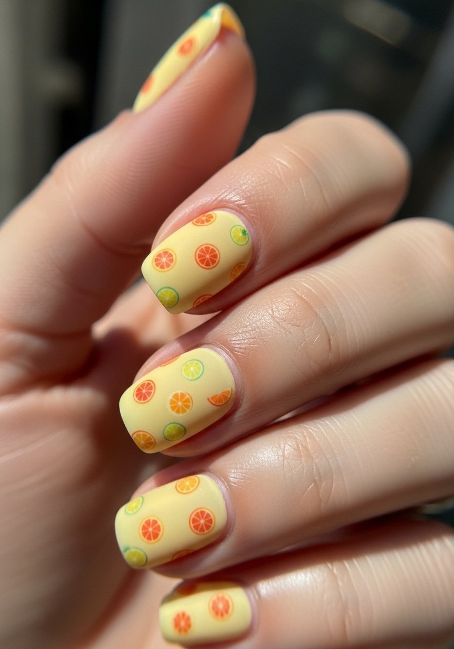 Tiny citrus decals or hand-painted slices give summer energy without full-on neon. I secure decals with a thin layer of builder gel, cure, and finish with glossy top coat for longevity—Gel-top-coat-high-shine ensures seal. I’ve found clients love how a small cheerful motif lifts an otherwise neutral set.