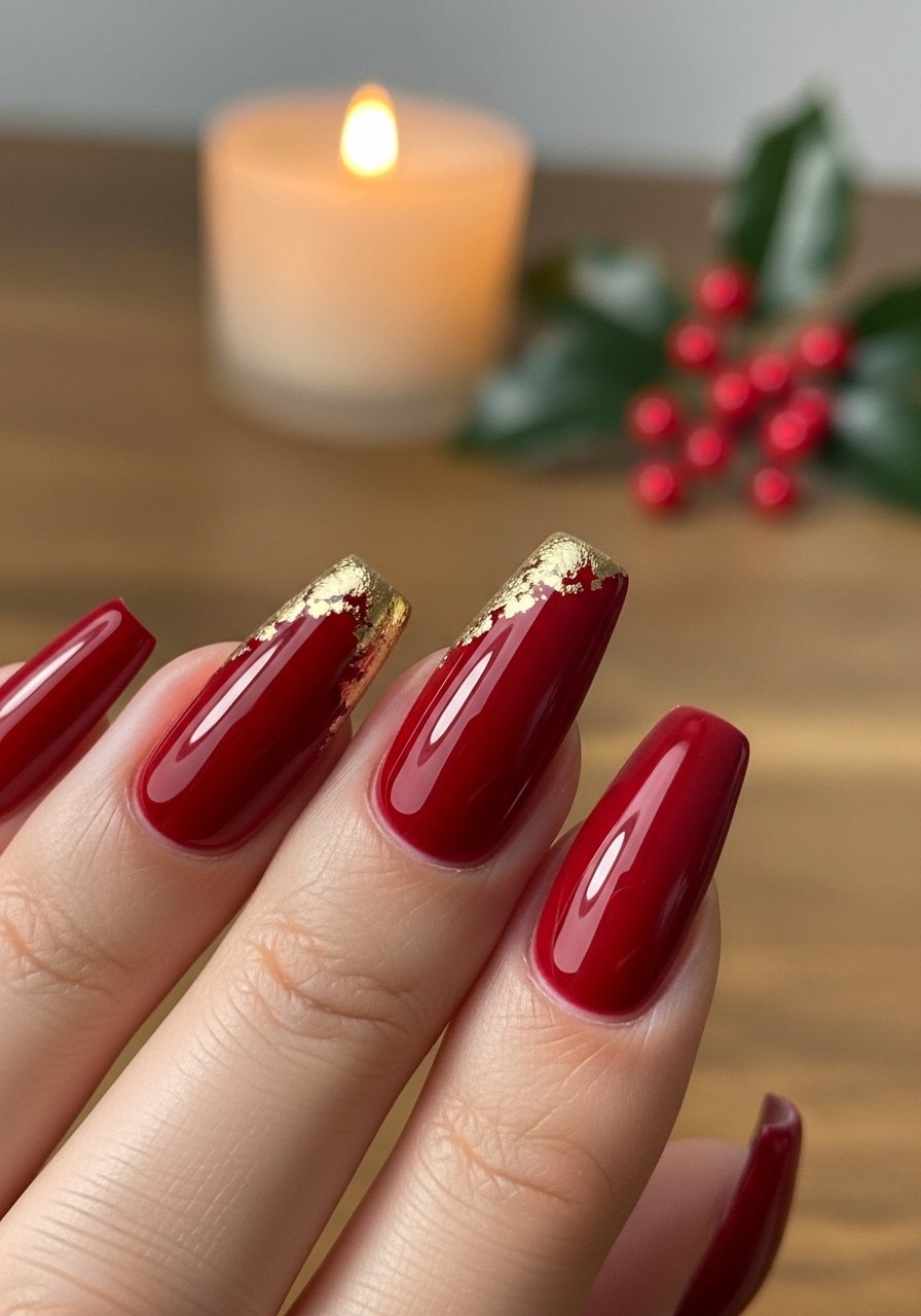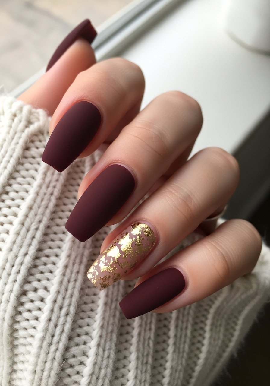 Matte burgundy balances warmth with quiet sophistication; a few gold flakes add seasonal shine. I matte the burgundy with cured matte top coat and apply flakes with a tiny dab of builder gel, sealing with a glossy top coat only on the flake nail to keep contrast. I’ve found matte plus selective shine feels modern and intentional.