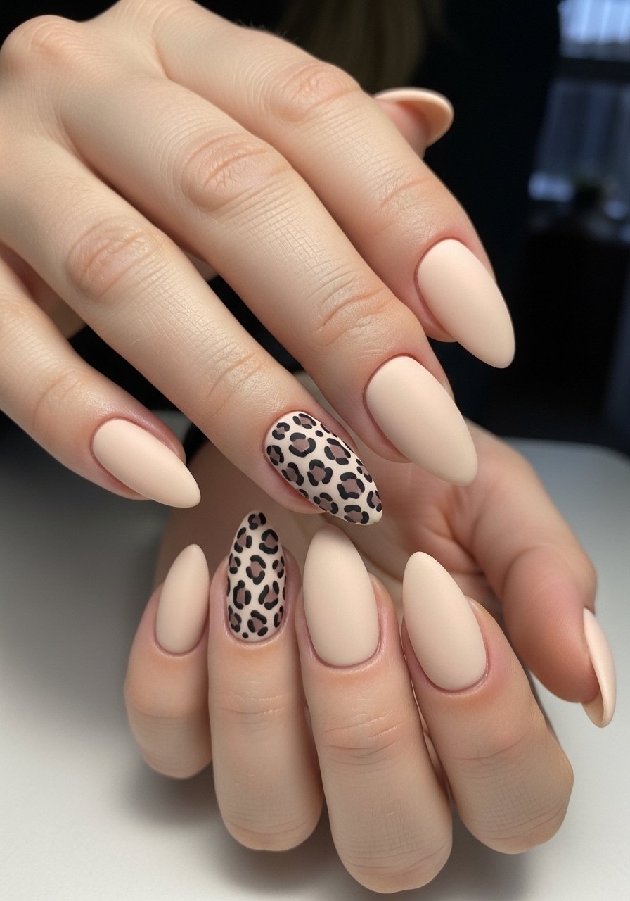 A single animal-print accent keeps drama in check. I mix two warm tones for the base and dot darker rings with a thin brush; Nail-art-brush-set is useful for the tiny spots. I’ve noticed accent prints read chic rather than loud when limited to one or two nails.
