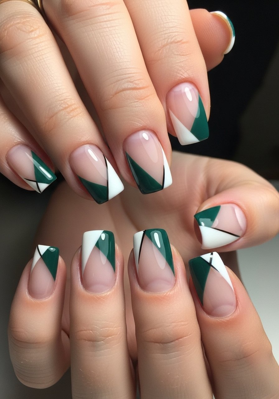 Negative-space geometry gives graphic interest without heavy lacquer—use striping tape for crisp edges and cure each section. I use a mix of opaque and sheer gels to create contrast; Gel-base-coat keeps layers bonded. I’ve noticed geometric looks age well because chips blend into the structured pattern.