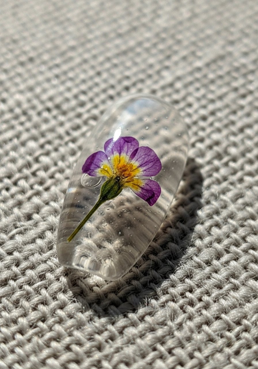 I press small dried blooms and sandwich them between thin layers of builder gel for a preserved, dimensional look. Keep flowers tiny to prevent edges from lifting, and seal with Builder-gel-clear. I’ve experimented with this and found it lasts well when flowers are fully encapsulated.