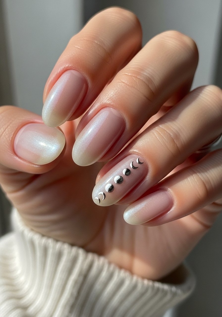 Moon-phase accents in pearl look subtle and thoughtful. I paint small crescents and dots in a pearlescent gel and seal—Gel-polish-classic-colors works well. I’ve noticed celestial motifs stay elegant when small and placed asymmetrically.