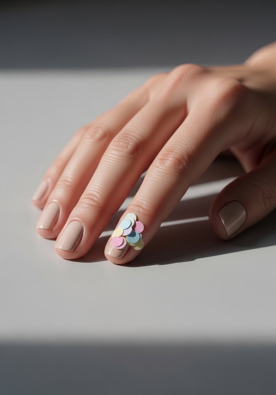 A tiny confetti cluster feels celebratory but understated when confined to one nail. Place small bits in clear builder gel, cure, and top coat to lock in—Builder-gel-clear works well. I’ve noticed confetti clusters are forgiving if you choose small pieces and encapsulate them fully.