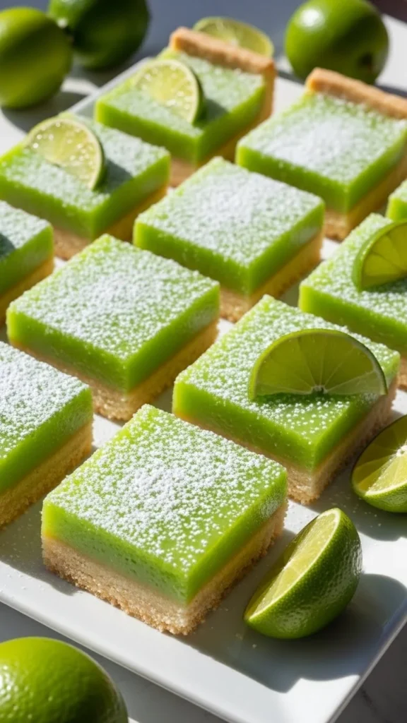 These bars are tangy, creamy, and refreshing. The citrus filling balances the buttery crust. They set firmly and slice neatly. The bright green color feels cheerful. Perfect for warmer days.