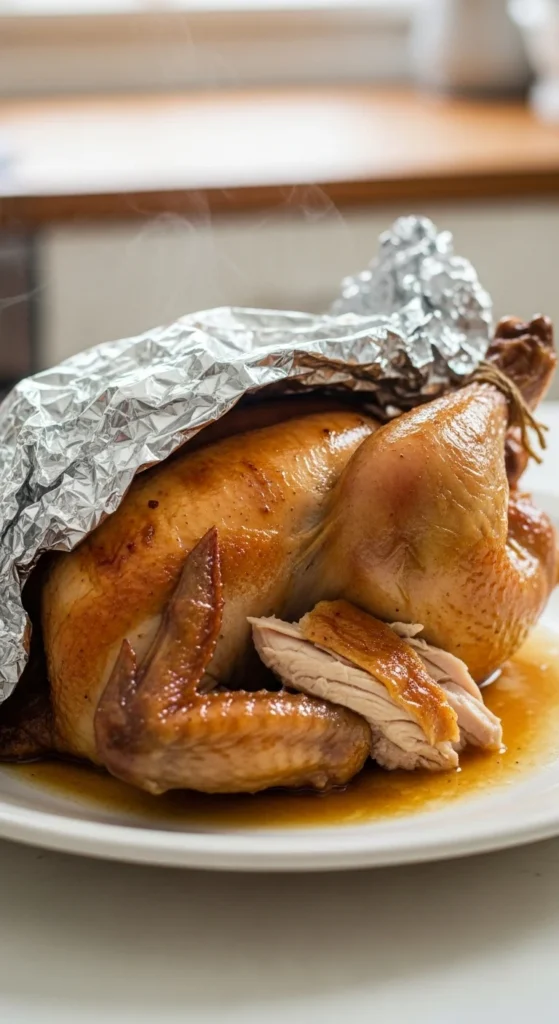 Rest chicken for 5–10 minutes depending on size. Tent loosely with foil to keep warm.