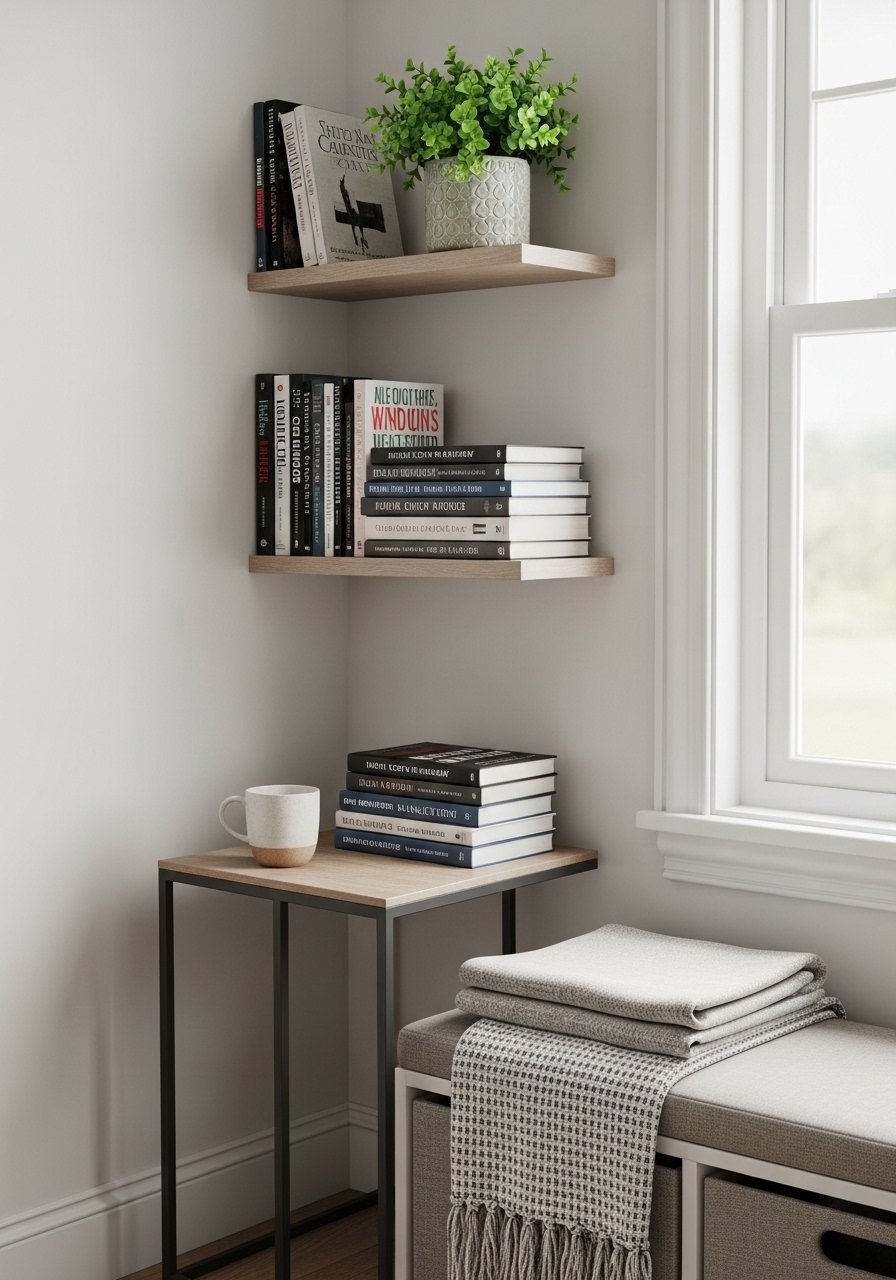 You need a place for a drink, a phone, and your current stack of books. I mounted a floating-wall-shelf-set at elbow height for easy reach and used a narrow side table for spills and lamps. For hidden gear, a plain bench doubles as a charging station if you route a cable inside. That bench became a game changer, because I stopped leaving chargers around, and my nook stayed tidy. Another fresh idea: add a small magnetic strip on the shelf for metal bookmarks or glasses, keeps things off the floor.