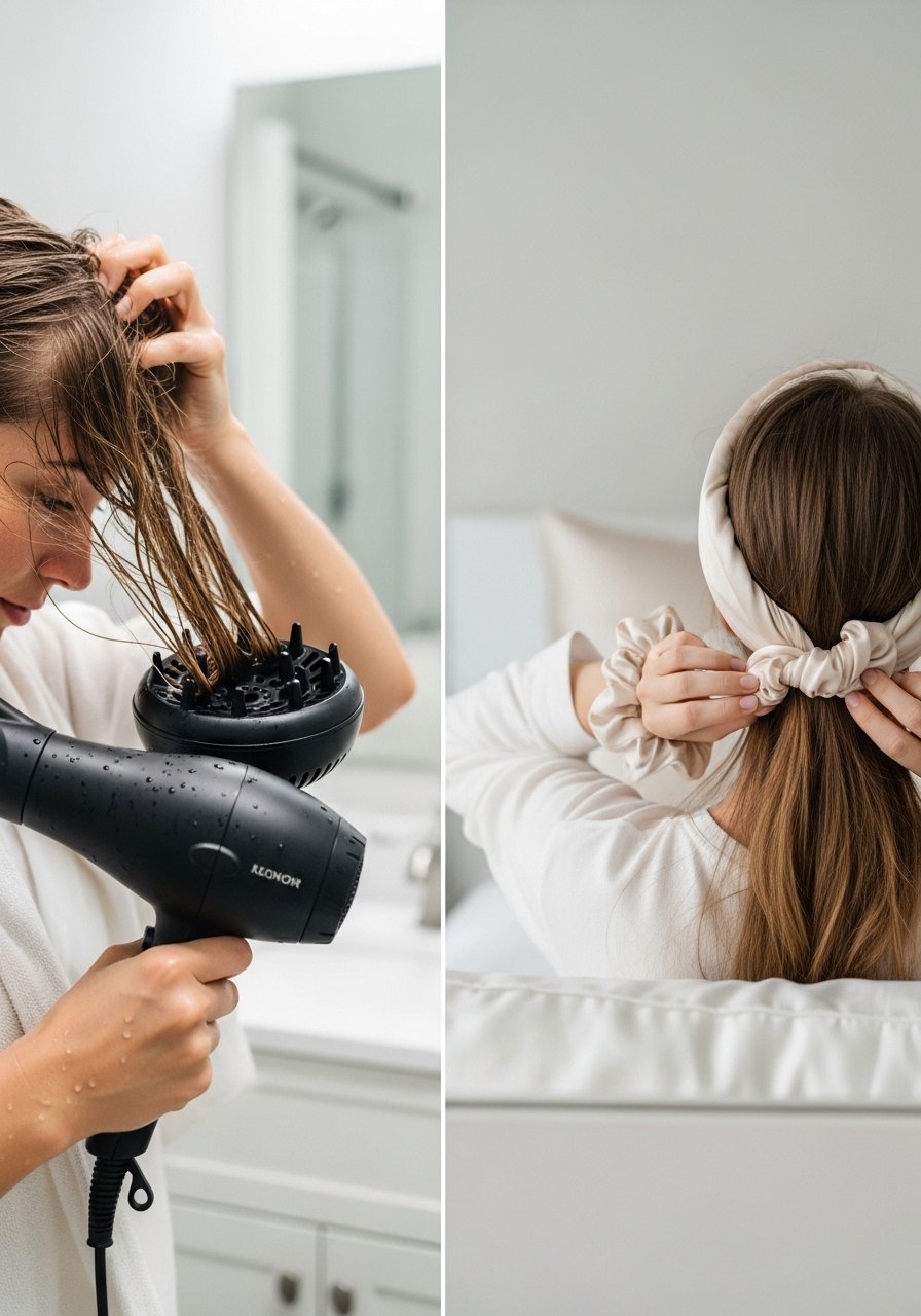 For a quick finish, diffuse on low-medium heat with a diffuser-attachment, cupping curls and holding each section for 8–12 seconds. For heatless waves, try my silk-scrunchie twist: wrap damp sections into loose loops and secure with silk-scrunchies overnight. I’ve found heatless methods hold better about half the time but are gentler long-term. Common mistake: blasting high heat—this flattens natural texture and causes frizz. Example: I diffuse roots first for 30 seconds then finish mid-lengths.
