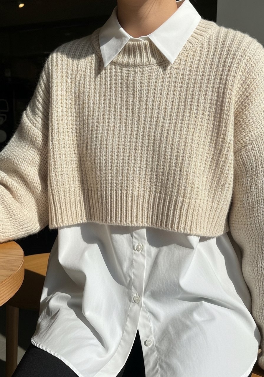 I love the layered hem and collar peek from an oversized shirt under a cropped sweater. It gives shape and dimension without much effort. I cuff the shirt sleeves to control volume. Try oversized-button-up-women and cropped-sweater-women. This trick made my casual outfits look more intentional on days I did not want to think much.