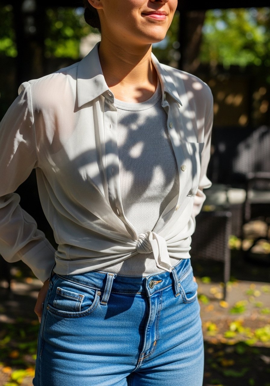 A sheer shirt is a playful spring layer. I throw it over a ribbed tank and tuck into high-waist jeans for balance. It adds color and airiness without extra warmth. Choose a breathable fabric like voile and a tank like ribbed-tank-womens. I once tried a sheer top over a bulky tee and it lost the intended lightness.