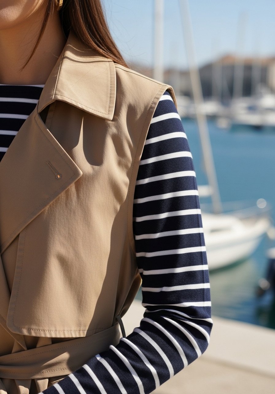 A trench vest gives the trench silhouette without sleeve weight. I wear it over a striped top for a nautical vibe. It looks chic with cropped trousers or a skirt. I recommend sleeveless-trench-women and striped-long-sleeve-top. I tried this at a seaside weekend and it made outfits feel more intentional without overheating.