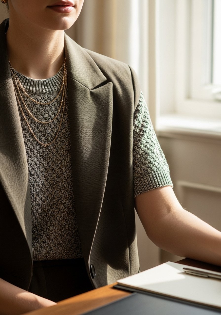 20. Blazer with Short-Sleeve Knit and Necklace Layering