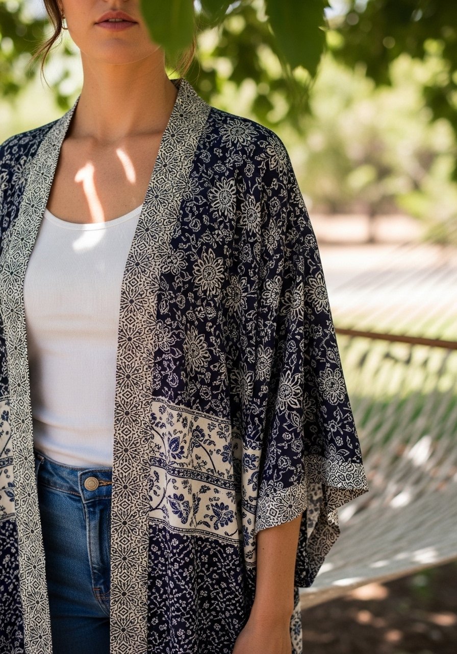 A lightweight kimono gives outfits a relaxed, artsy vibe. I keep the rest of the outfit simple so the print can stand out. It is ideal for brunch or outdoor markets. I use kimono-jacket-women over ribbed-tank-womens. Once I paired it with competing prints and it looked messy, so I stick to solids underneath.