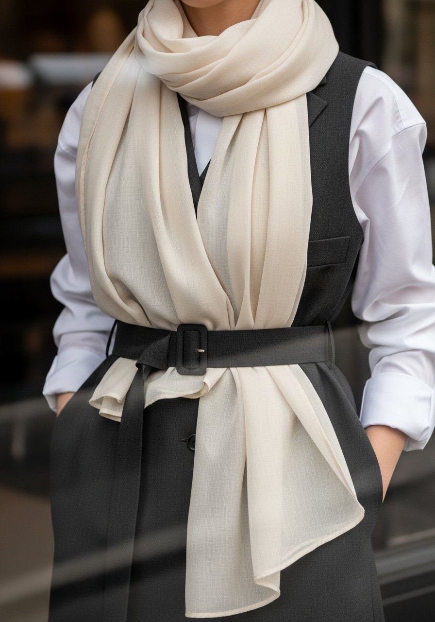 This is a fresh trick I started using: layer a vest, drape a large scarf over it, then belt the scarf at the waist. It acts like a cape and defines the silhouette instantly. I use tailored-vest-women and lightweight-scarf-womens. It turned a simple outfit into something I got stopped for, in a good way.