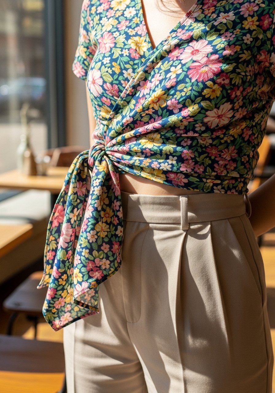A wrap top flatters many shapes because it creates a waist without feeling tight. I like pairing it with cropped tailored trousers and low block heels, especially for a museum morning. Throw on a lightweight-trench-coat if it’s breezy. Small statement like a gold bracelet reads pulled-together on photos without fuss.