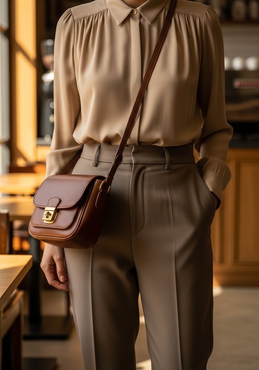 Wearing one color family makes you look intentionally styled with minimal effort. I like beige on top and a slightly darker taupe pant for a soft contrast. Add leather-crossbody-bag and delicate hoops. Tonal looks are surprisingly forgiving in photos and easy to accessorize.