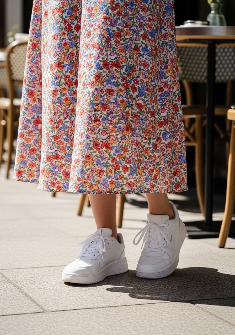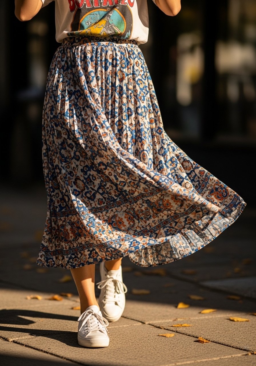 This was my fallback when I wanted comfort and personality. Tuck a lightweight graphic tee into a printed midi skirt, add white sneakers and a denim jacket for a relaxed vibe. I once paired this with a thrifted belt and it upgraded the look instantly. Patterns hide small stains and crumbs, which I appreciated on a picnic.