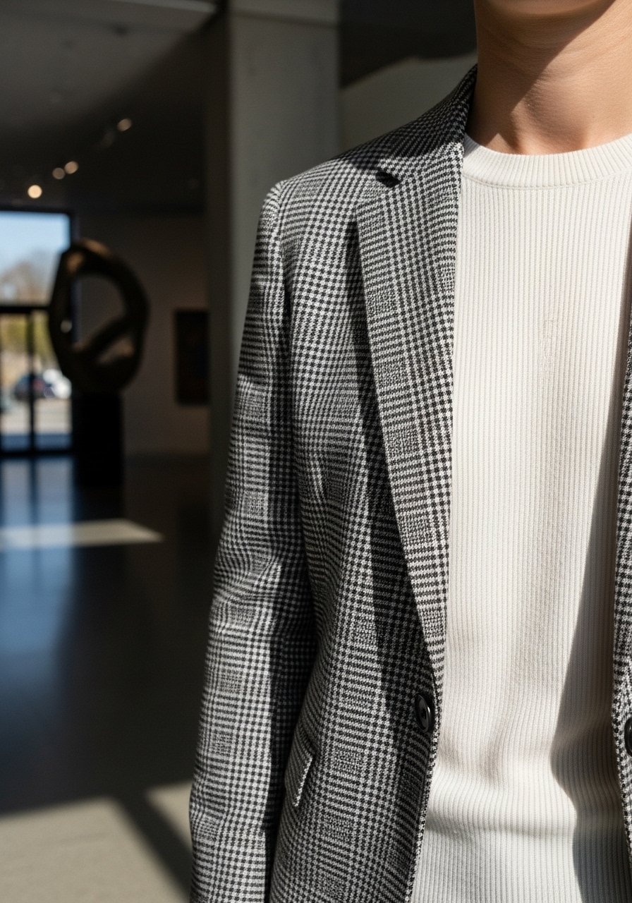 A checked blazer instantly adds visual interest to a simple outfit. Pair with a soft knit tee and straight jeans, add loafers for a refined casual look. I keep a neutral scarf handy to soften the pattern if photos look busy.