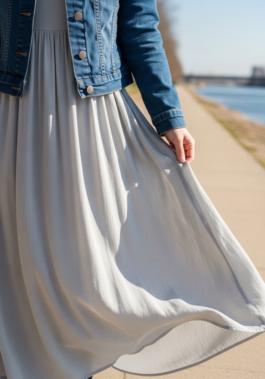Maxi dresses feel effortless and are great when you want coverage for an outdoor event. Layer with a denim jacket for structure and add comfortable sandals. I found this combo works for dinners to daytime walks, and it hides crumbs better than lighter fabrics.
