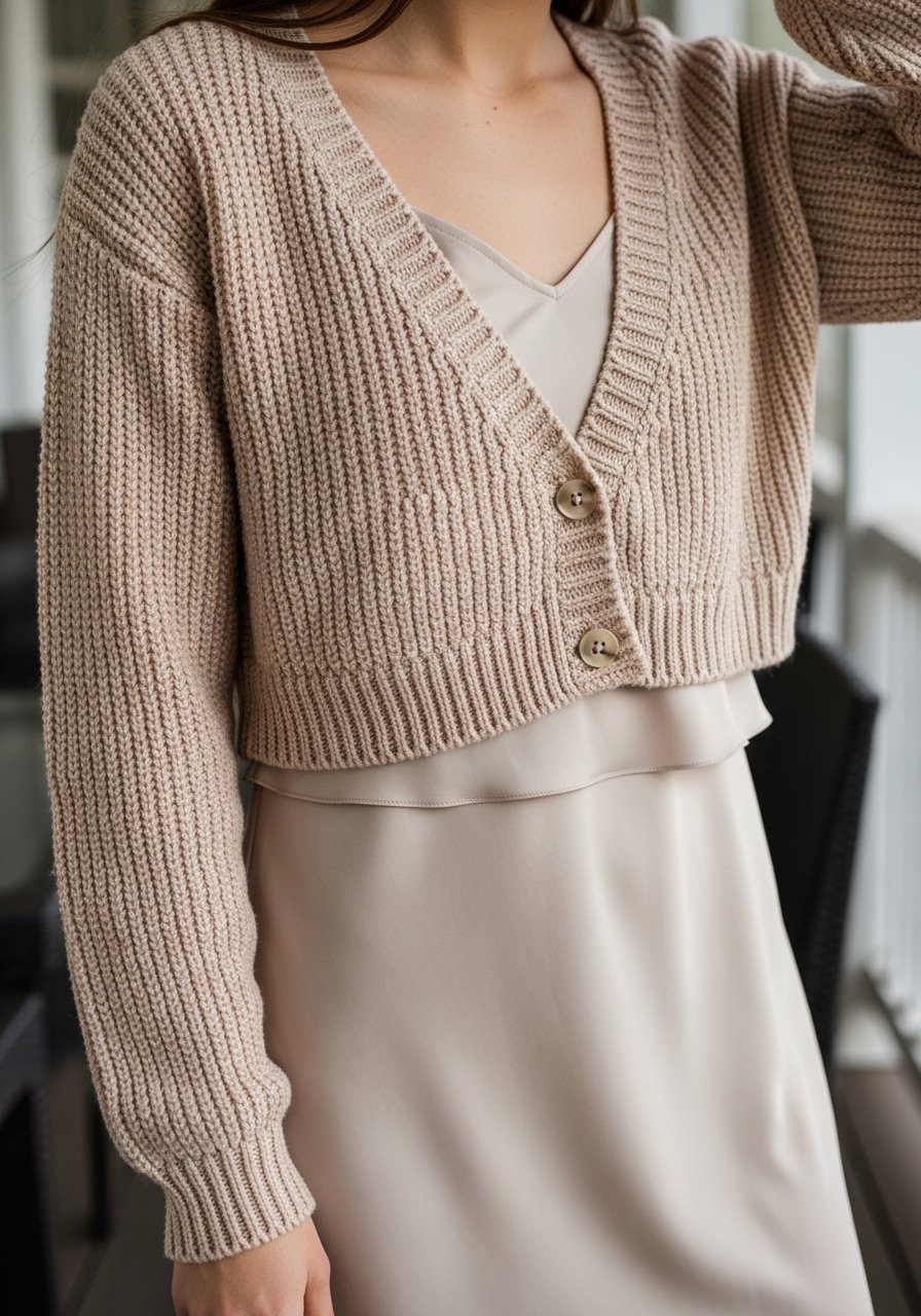 A cropped cardigan softens a slip dress and makes it daytime-appropriate. I layered this combo for an afternoon tea and felt relaxed yet dressed-up. Add kitten heels or ballet flats, and a minimal pendant. The cropped length keeps proportions balanced for most heights.