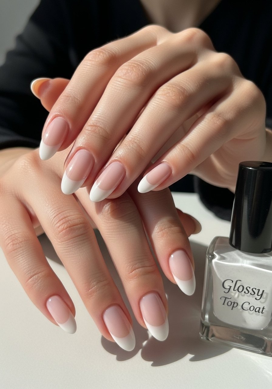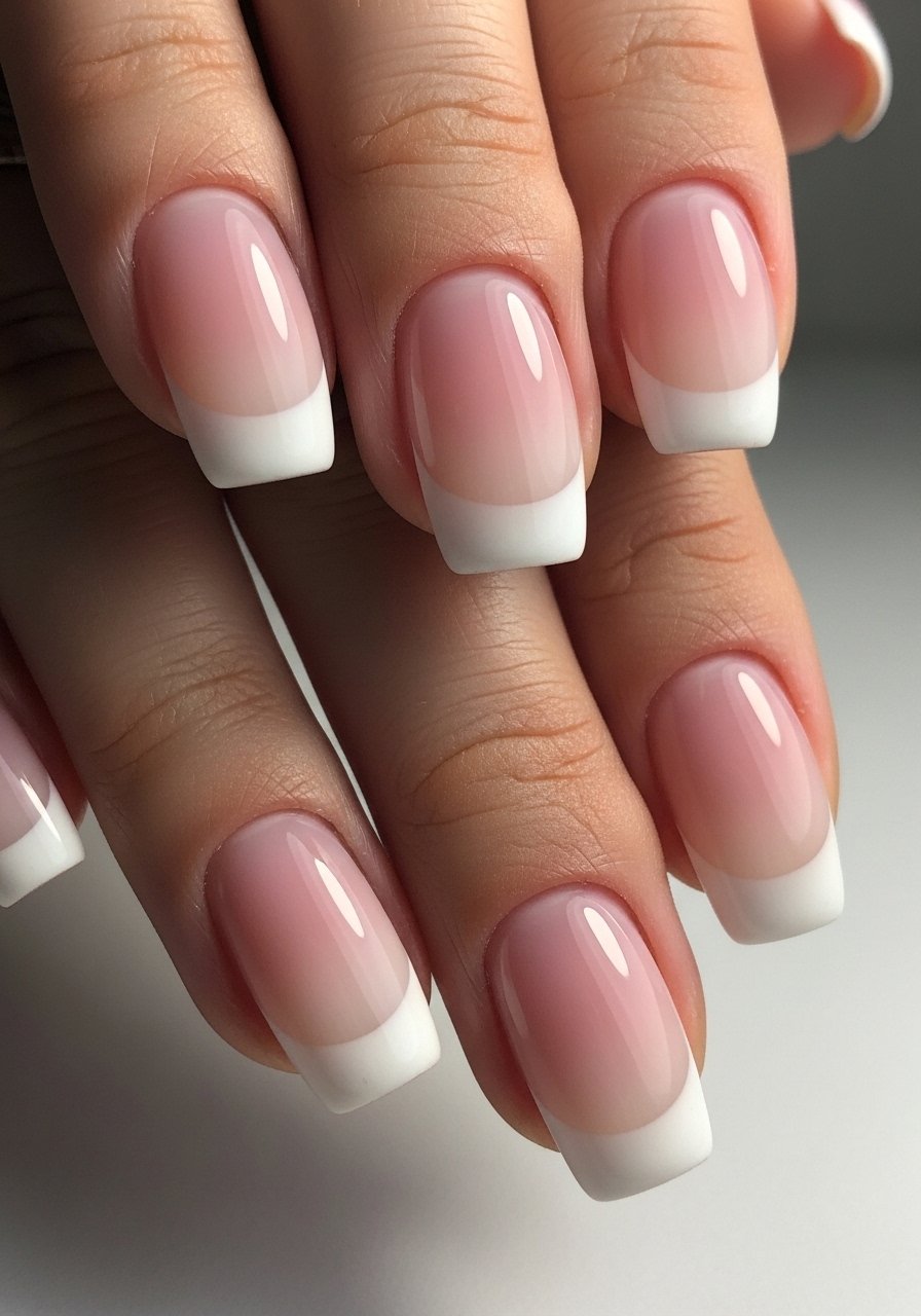 This is the salon staple: sheer pink base, white tip blended with a sponge or brush. I switch between a gel base and regular polish depending on time. My clients often ask for this because it looks clean even as it grows out. nail-uv-led-lamp plus a good base coat makes it last.