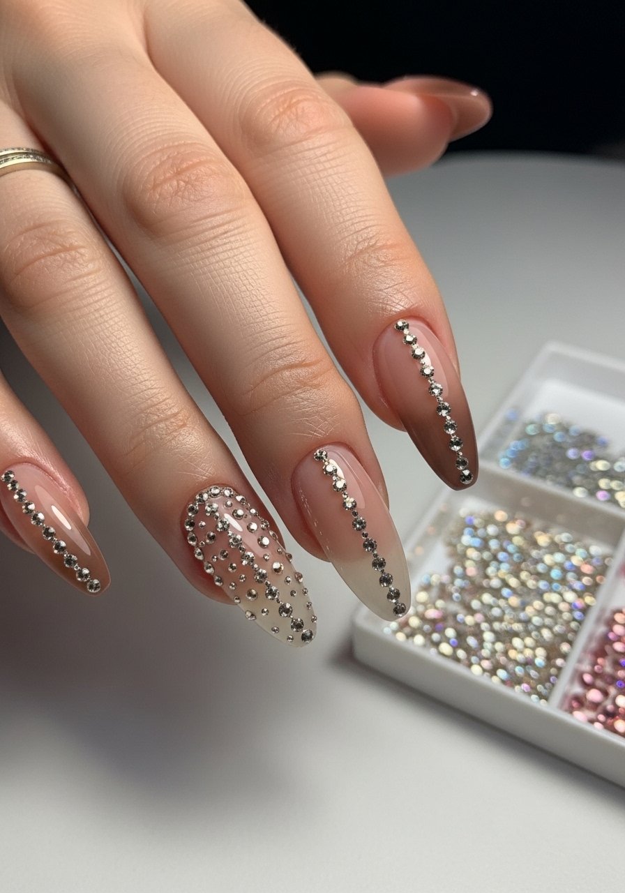 After creating a soft fade, place tiny gems along the gradient line, using a drop of top coat or gel to adhere. I keep a small rhinestone kit in my drawer for quick bling. One gem can change the whole vibe from casual to event-ready.