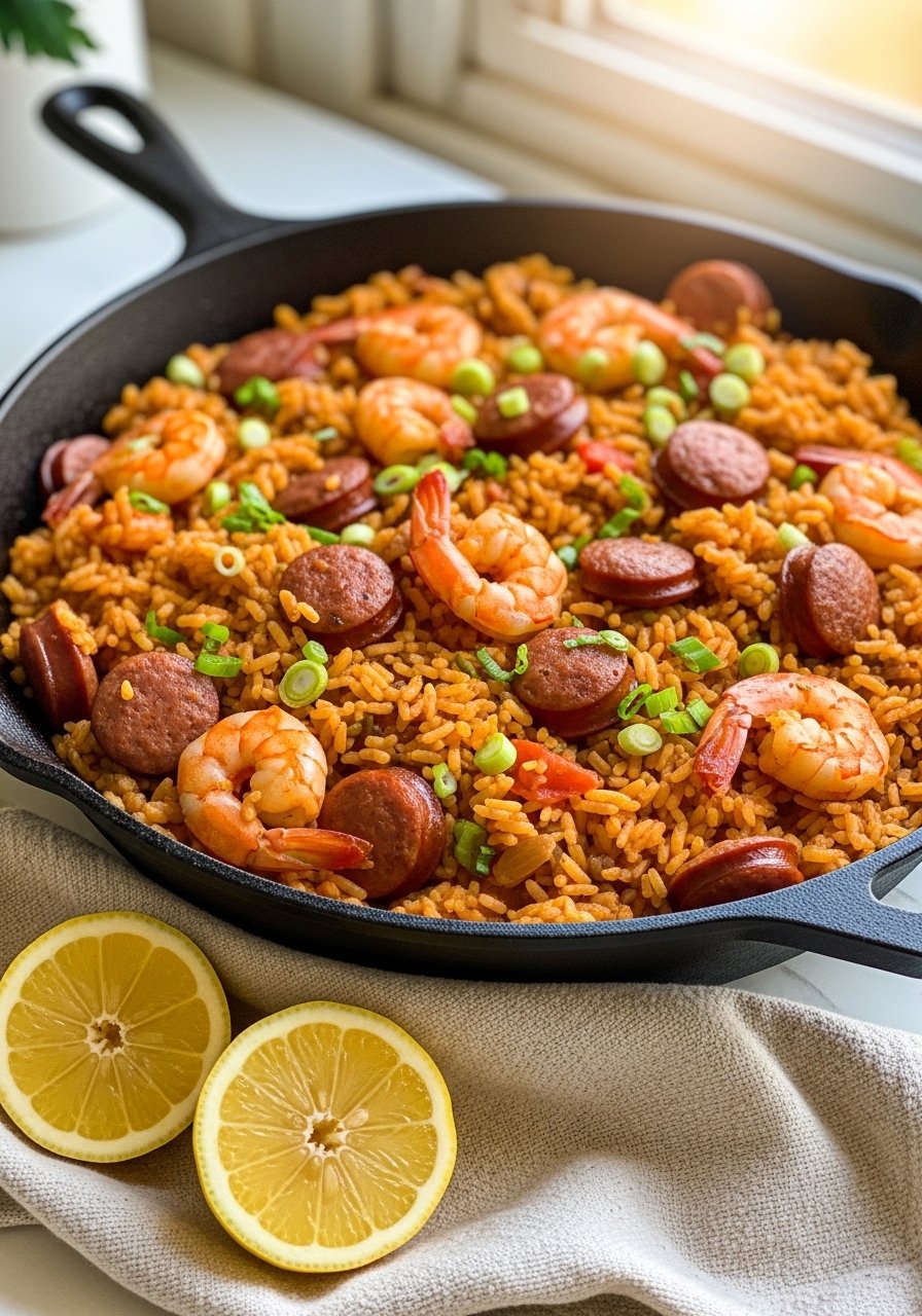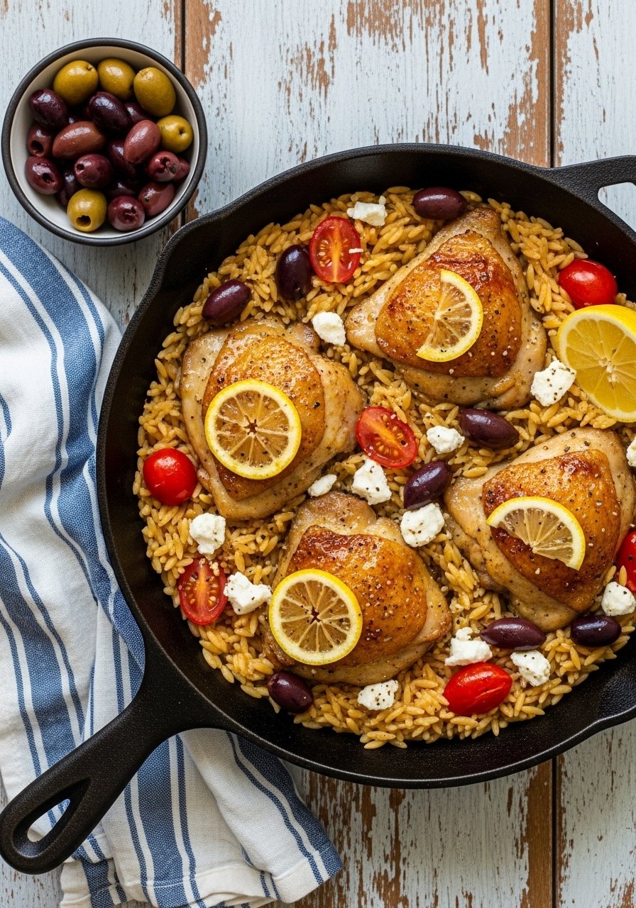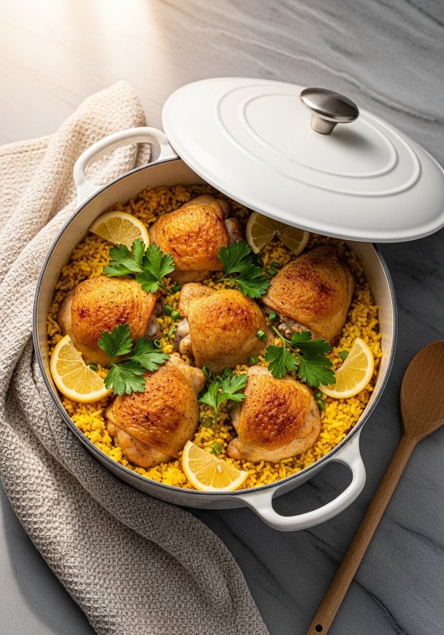 Bright lemon, savory garlic, and tender chicken cooked right on top of fragrant rice make this a weeknight staple. The rice soaks up pan juices for deep flavor and a slightly crisp bottom. It’s lemony, garlicky, and comforting—great for picky eaters and dinner guests alike. I like to brown the chicken in a cast iron skillet first for extra color.