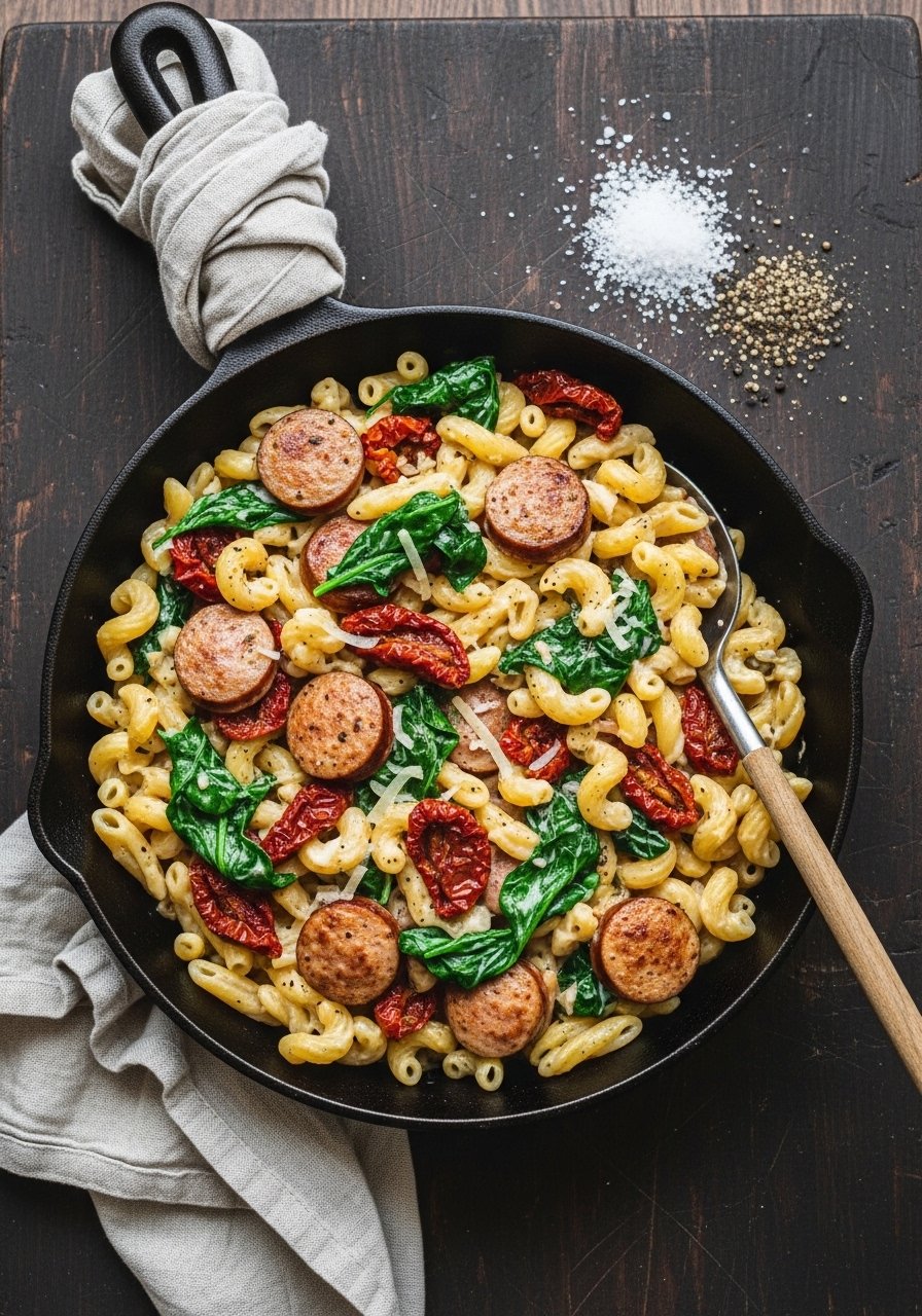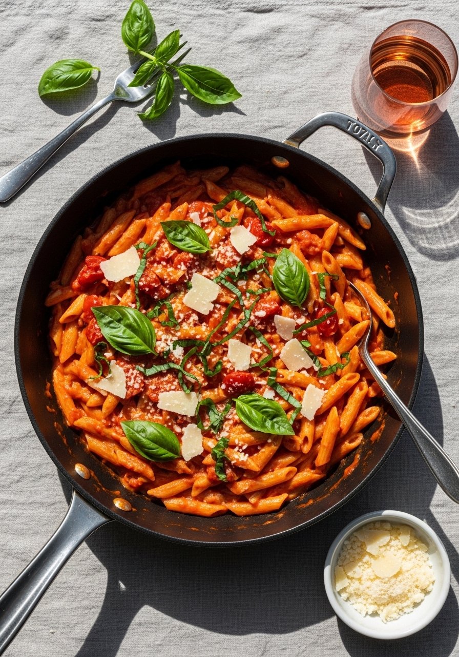This creamy tomato basil pasta cooks all in one skillet—no draining, no fuss. The sauce starts bright and fresh, then turns silky as the pasta releases starch. It’s herb-forward with a hint of sweetness, perfect for busy weeknights or date nights. Stir with a silicone spatula to keep the pan pristine.