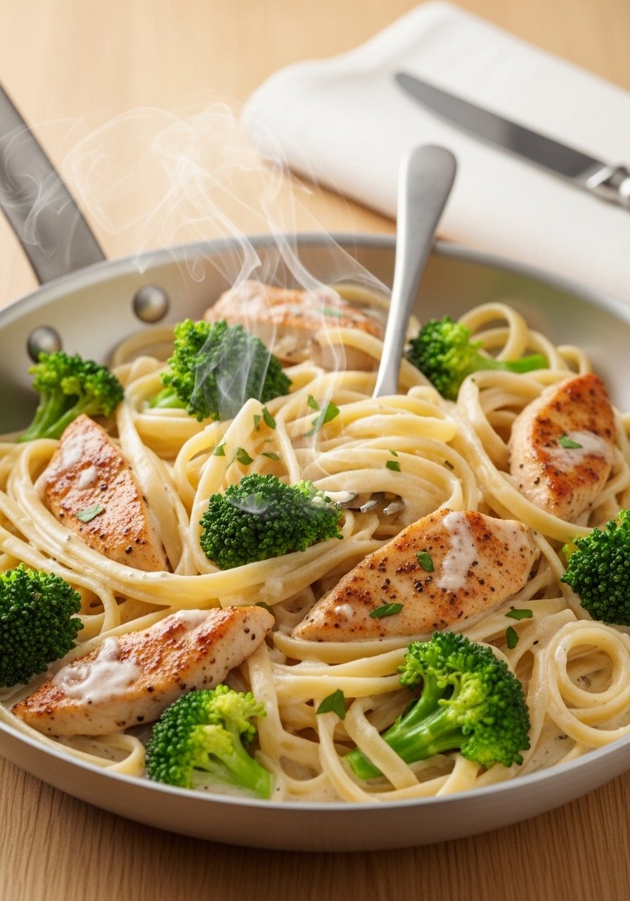 Rich, creamy Alfredo meets tender chicken and crisp broccoli in one pan. The sauce clings to pasta for a luxurious bite without separate sauce-making. It’s indulgent but practical—great for company or a cozy night. Use a non-stick pan to keep cleanup quick.
