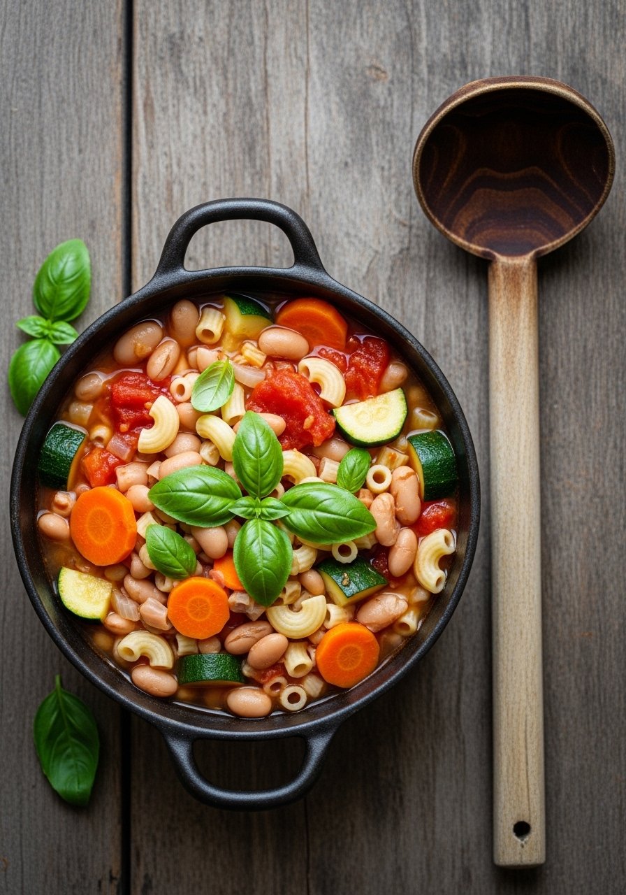 Plate into shallow bowls and finish with extra basil and grated Parmesan. Pair with a simple green salad and garlic bread on a serving platter. Store leftovers in glass meal prep containers for up to 3 days; reheat gently with a splash of water or broth to revive the sauce.