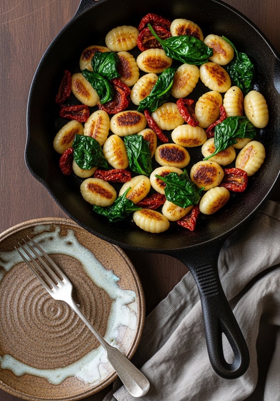 - Heat oil in a large skillet over medium-high heat. Add gnocchi and sear 2–3 minutes until lightly golden.