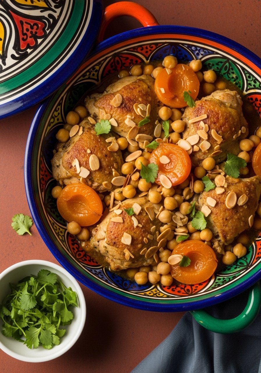 Warm Moroccan spices, sweet apricots, and hearty chickpeas create a fragrant one-pot dish that’s both exotic and simple. The sauce is slightly sweet and spiced, perfect over couscous or rice. Toast almonds in a dry pan or use a small skillet.