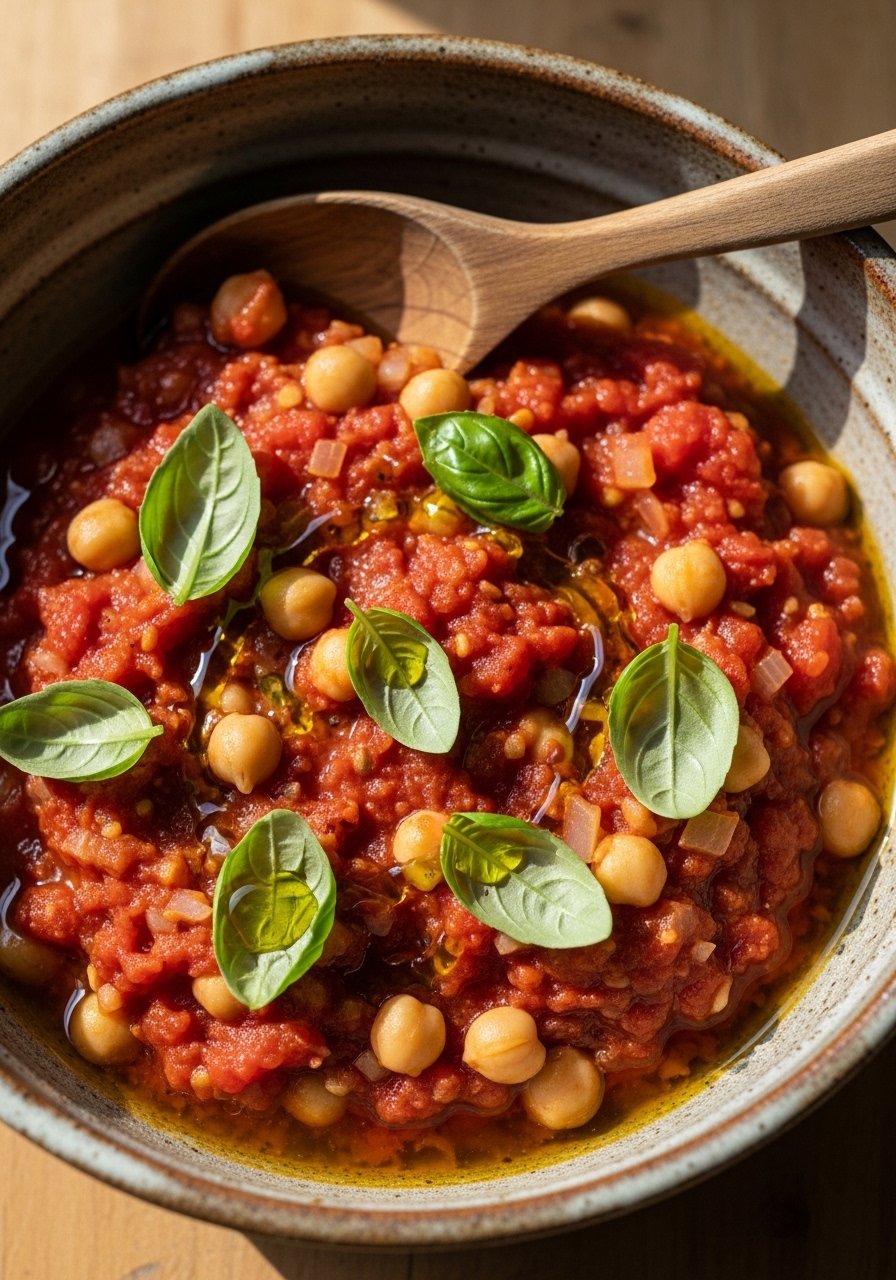 This simple chickpea stew is tomato-forward and herbaceous, with tender chickpeas and bright basil. It’s hearty enough for dinner and light enough for lunch. A splash of balsamic rounds the flavors—stir with a wooden spoon.
