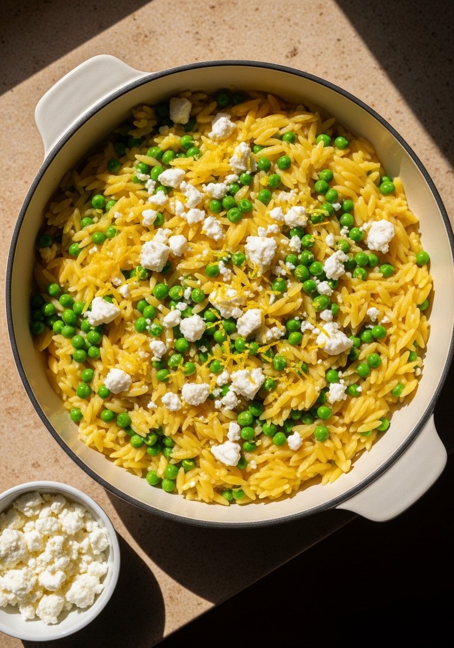 Light, lemony, and quick—this orzo cooks in one pot and finishes with fresh herbs and feta for brightness. It’s perfect as a light main or side dish. Zest lemon with a microplane grater for fragrant results.