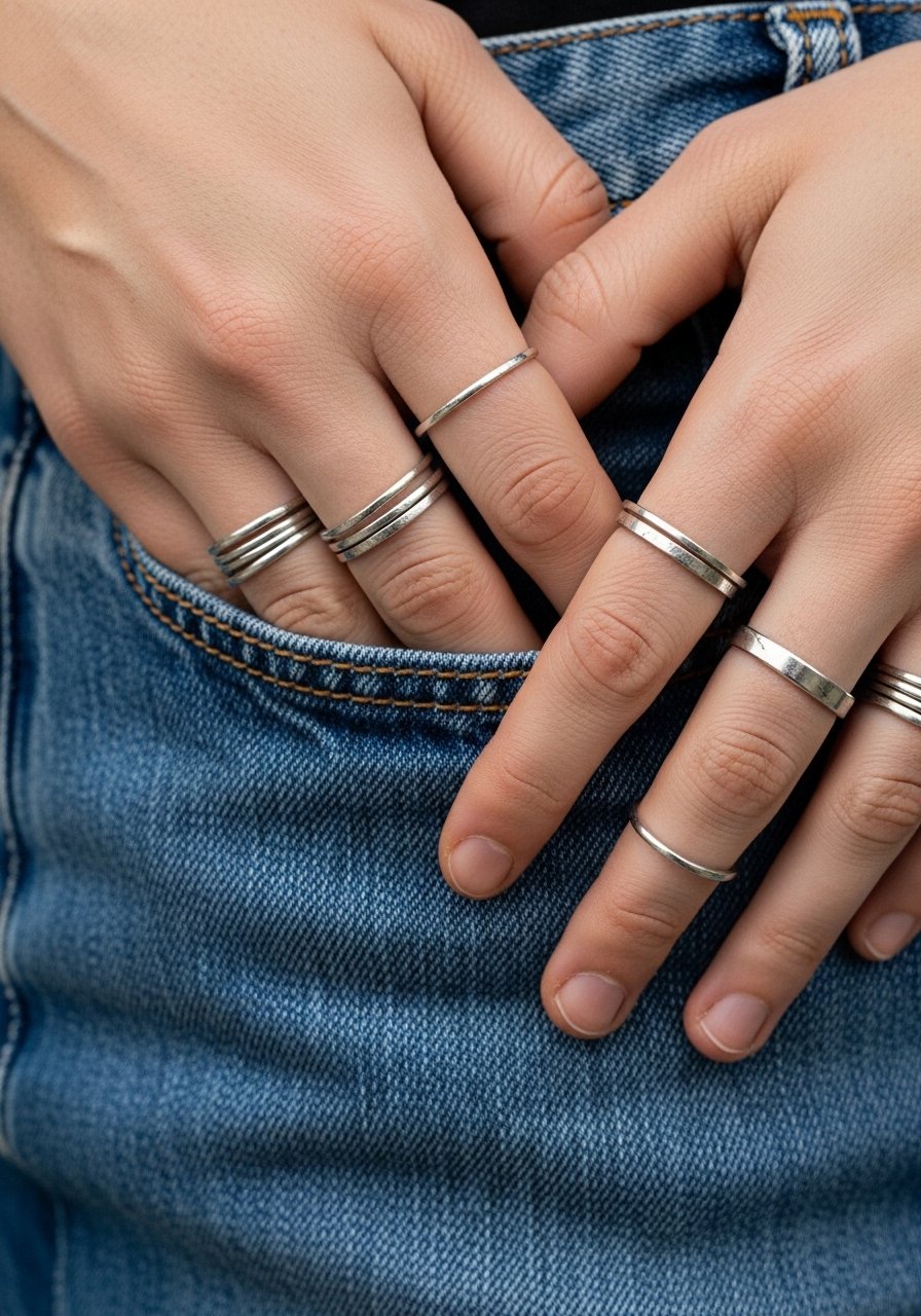I put on several thin rings up and across knuckles instead of one chunky piece. It looks collected and friendly. One time I spilled coffee and the rings hid a stain, true story. A simple ring-set works on any hand size, and mixing textures keeps it interesting.