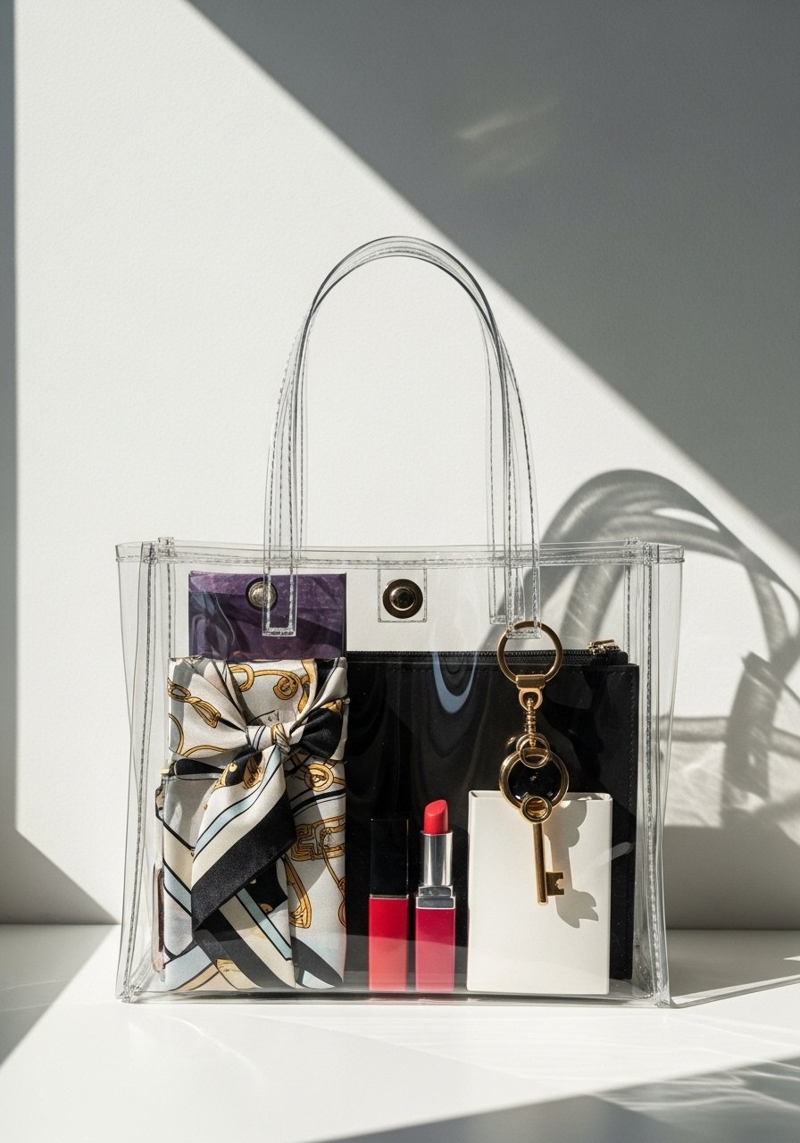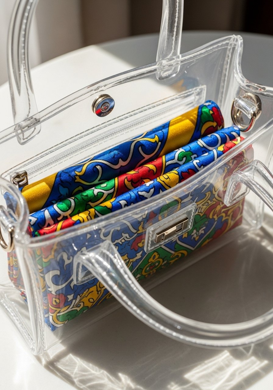If you use a clear or semi-transparent bag, place a patterned pocket square where it shows. I did this and people asked about my “bag art.” It’s cheap and changeable, and I switch patterns by mood. Try a silk-scarf-square for bright pops.