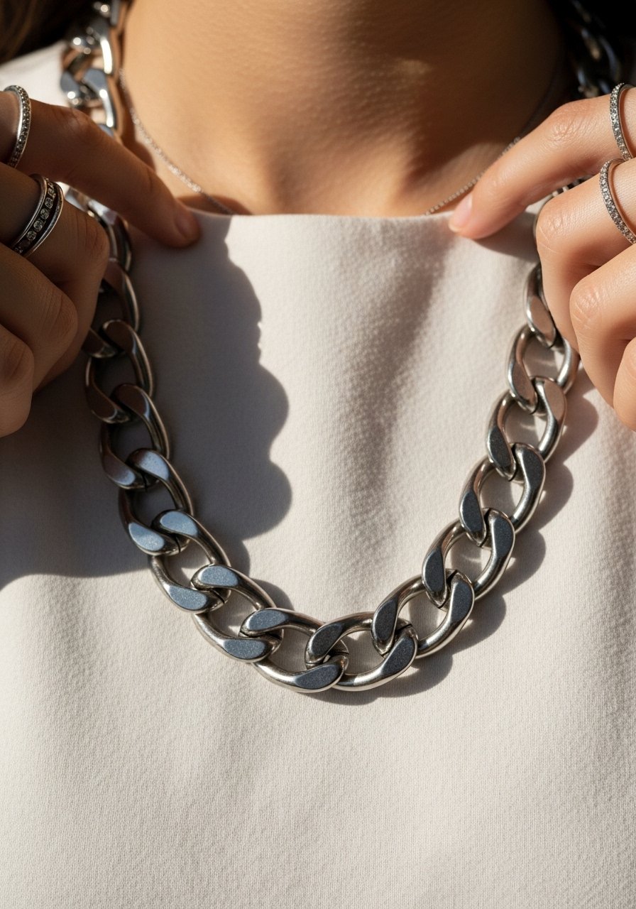 I love scale contrast, like a bold necklace against delicate hand jewelry. It balances drama and subtlety, and it’s less predictable than matching everything. Try a chunky-chain-necklace with slim rings. I noticed this combo makes evening dressing feel less costumey.