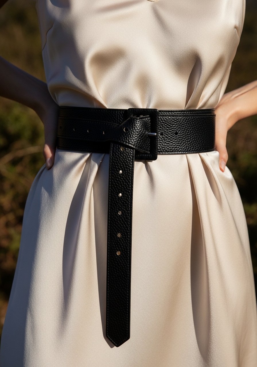 I wear my silk dresses with a slightly rugged leather belt to ground the look. The leather adds structure and keeps satin from looking too delicate. I learned this after a date night when I wanted comfort and edge. Use a slim-leather-belt that’s not wider than your waist for proportion.