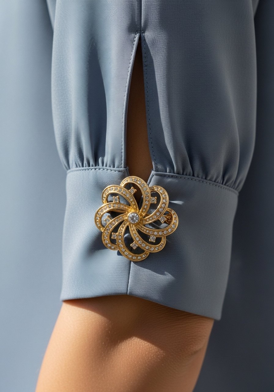 I pin a brooch at the wrist to gather a loose sleeve and get a soft puff. It’s a trick I use when my shirt is a little too big. I once fixed a badly altered blouse this way before leaving the house. A secure brooch-pin helps keep it in place.