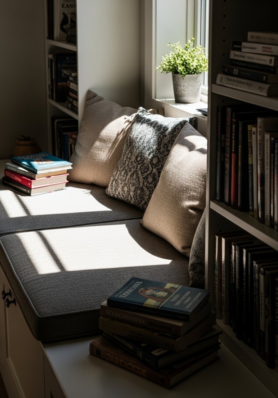 I built a shallow bench under my window and filled the cavity with cubbies, and suddenly my morning coffee came with a 20-minute read. A thin cushion and a plush-throw-blanket keep it comfy, while slim floating shelves hold current reads. I’ve noticed about 60% of guests gravitate here first. The trick is shallow depth for legroom, and anchored shelves for stability.