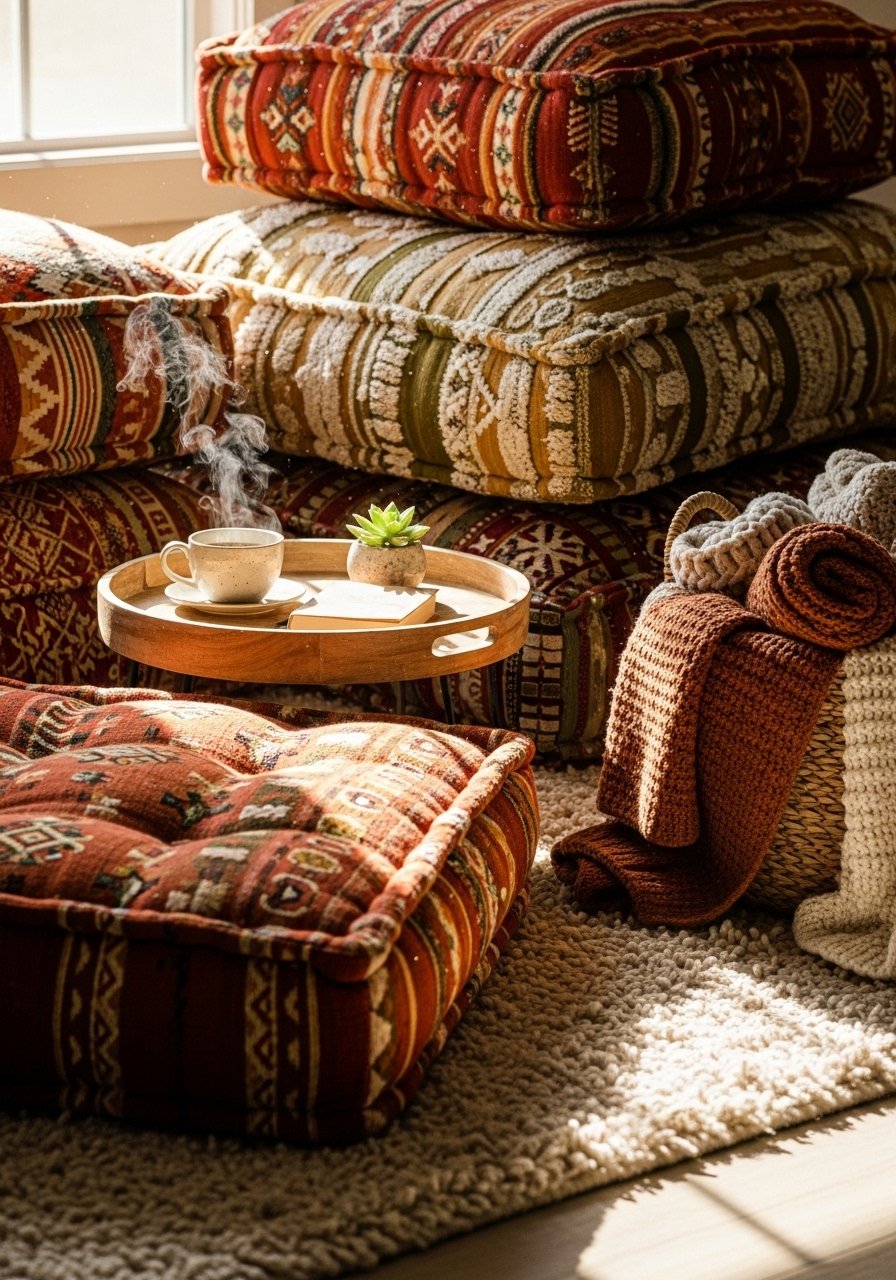 When I wanted flexible seating, I stacked floor cushions. Guests squeeze in. Kids read here during rainy Saturdays. Use a low side-table or a tray for mugs. This is budget-friendly and portable for small apartments. I once made a mistake buying thin cushions; invest in dense fill so they keep shape.