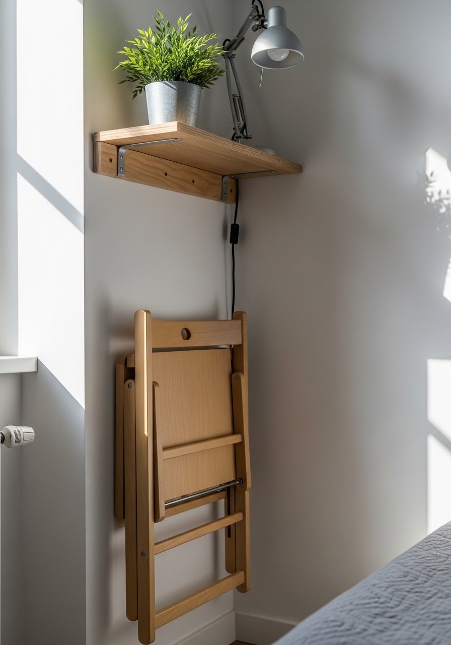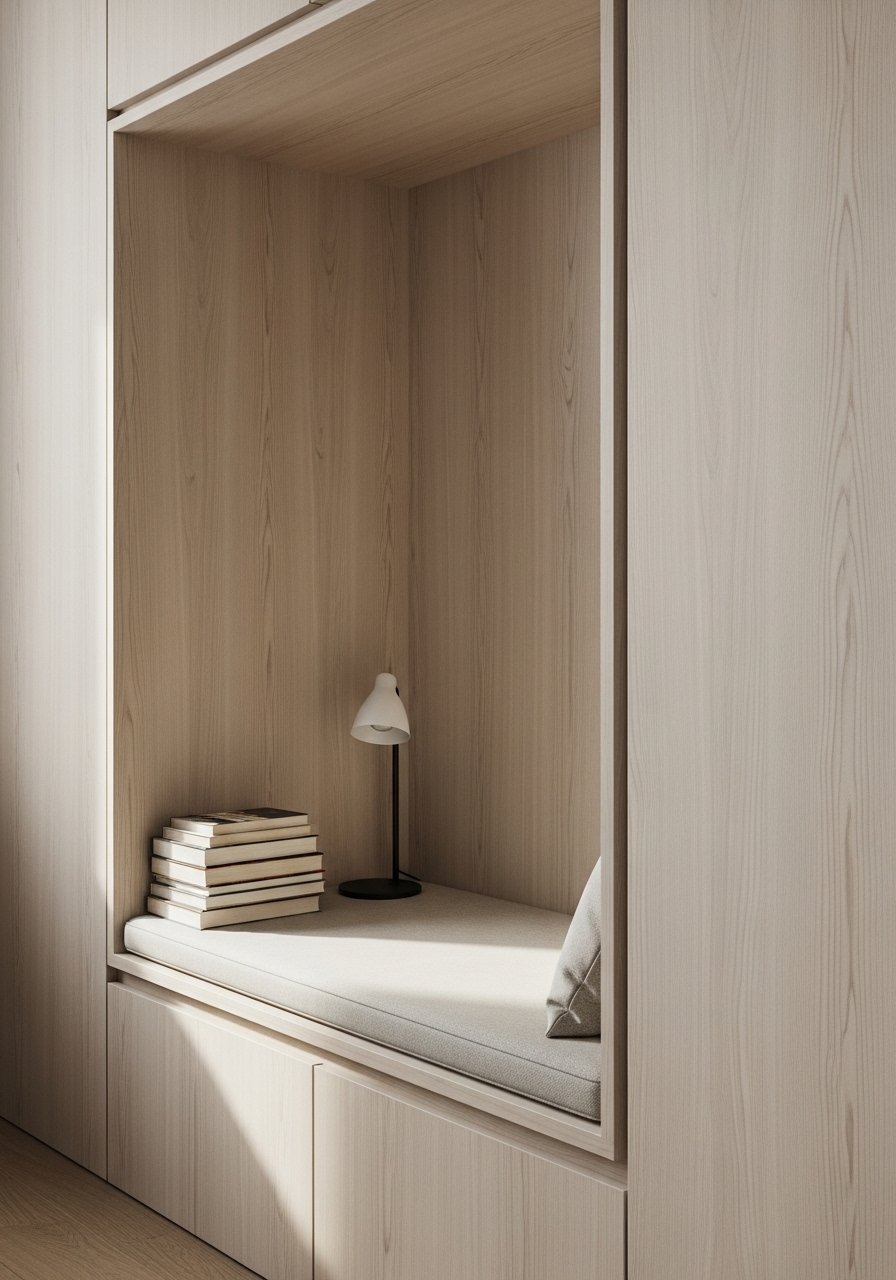 In my tiny studio I used a fold-down seat and vertical shelves to carve out a nook without losing floor area. A floating-shelf with a lip keeps books from sliding. This approach is cheap and renter-friendly. Keep proportions small and the color palette light.