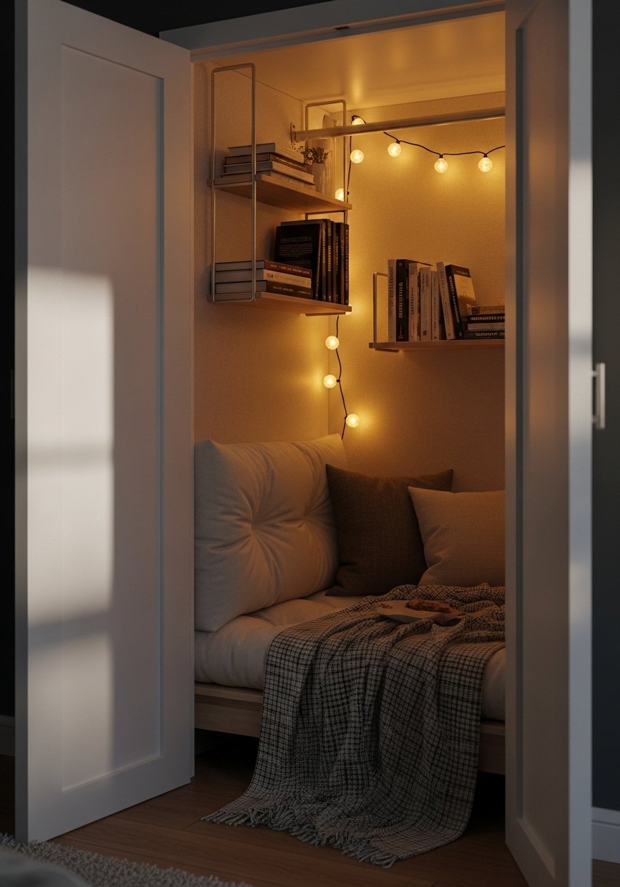 I gutted an unused closet and added cushions, and overnight I got the quietest reading spot in the house. It’s dark enough for focus but add warm bulbs for reading. Use narrow floating-shelf units and a compact lamp. This is a renter-friendly makeover that cost under $150 for me.