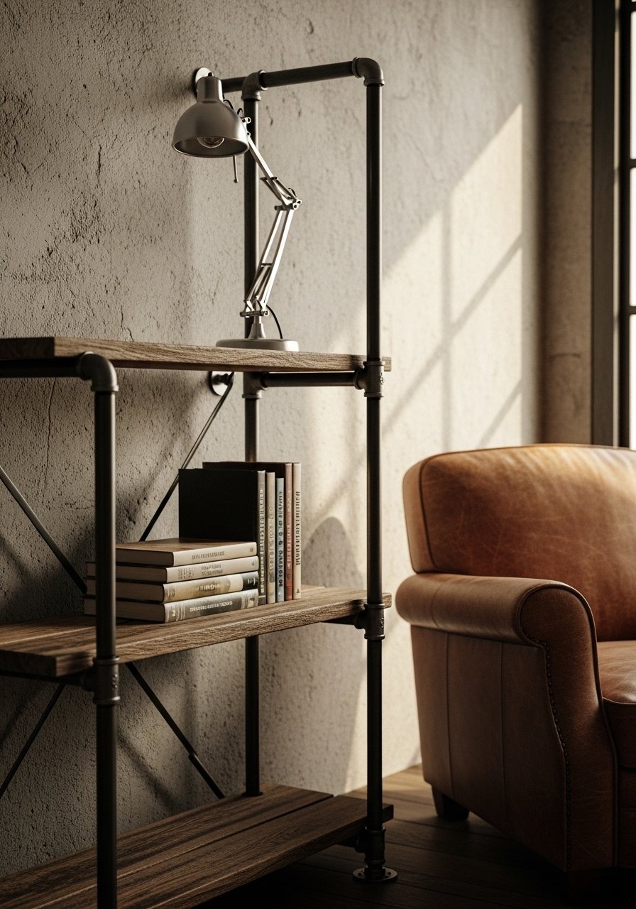 I used black pipe shelving to frame a leather chair, and it gave the corner structure and storage. The pipes feel sturdy and you can hang a lamp off them. Add a floating-shelf or two for display. This look pairs well with raw wood and a simple rug.