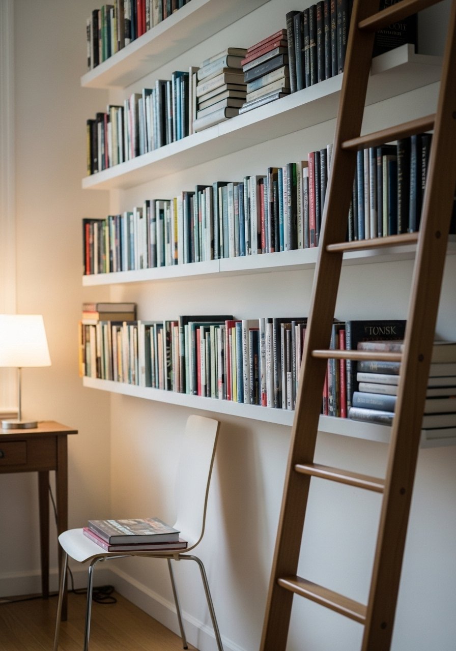 A vertical book ladder saved wall space and became visual interest. I leaned a ladder against a painted alcove and used staggered ledges for favorites. It’s compact and perfect when floor space is tight. Pair with a small pouf and a reading light. Use a side-table for drinks.